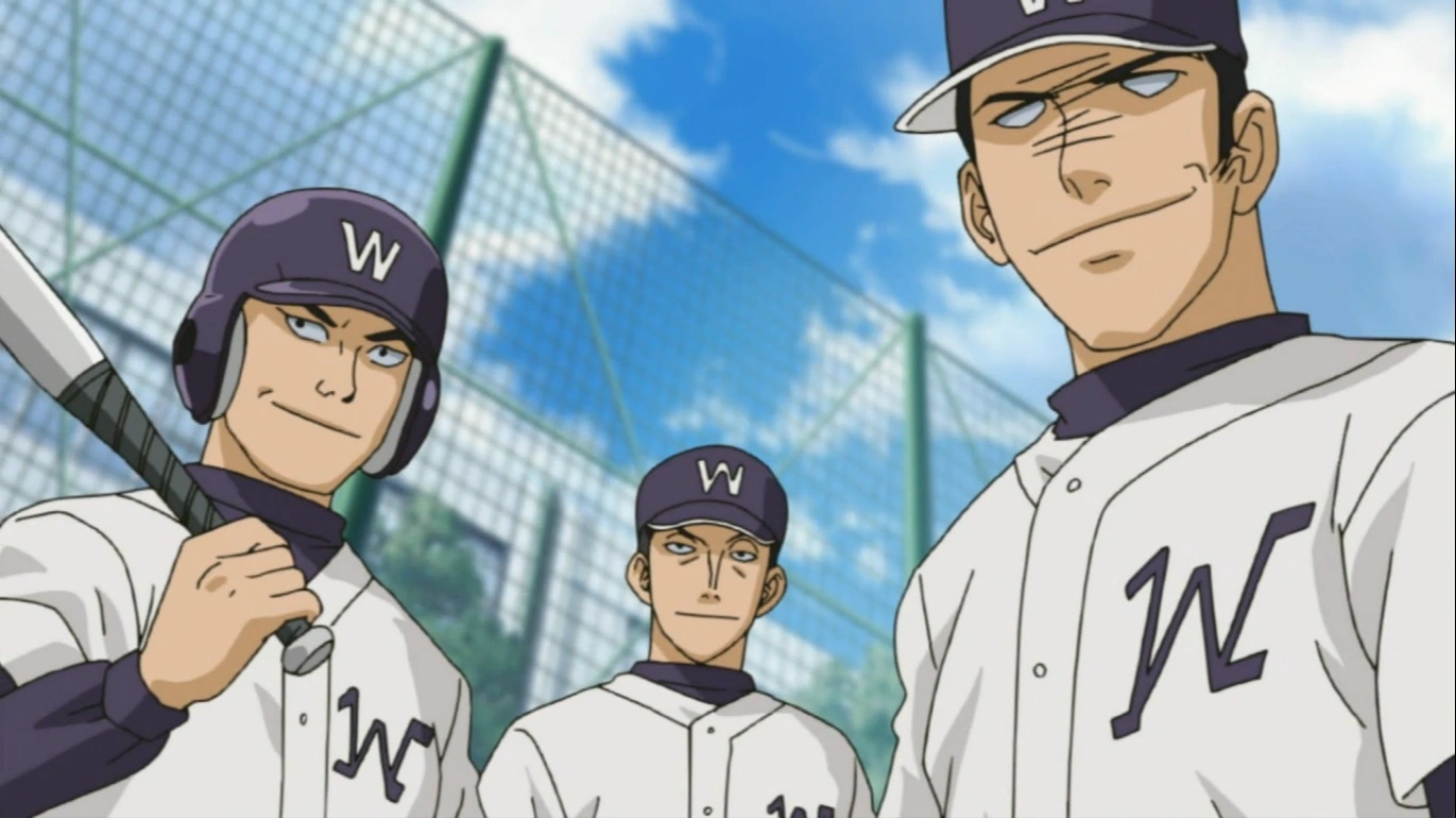 This is a very convoluted episode and many things were cut from the manga version of the conflict between Mifune East and Mifune West. Goro visiting his father's grave in chapter 131 was moved to the next episode. Also from chapter 131, the scene with Momoko and Shigeno at their home and the one where Komori and Oobayashi try to give up on the match were cut. The scenes from chapter 132 where the coach from Mifune West berates his players were cut. On chapter 134, everything after Goro strikes out three Mifune West players was cut out. The only thing adapted from chapter 135 is the training section. Goro leaving the football club was cut out from chapter 135 in the adaptation. The storyline were Muta and Oikawa leave the team and Yamane convinces them to get back by training for one more week from chapters 135 and 136 was also entirely ommited from the anime. Shimizu is also not present during this match in the manga, so her appearance here is original to the anime. She is, however, present during the second match, albeit under a different circumstance. Goro's flashback with Hideki is the only adapted scene from chapter 139, everything else was cut from the anime. Chapters 137, 140, 141, 142 and 143 were completely left out of the anime adaptation, as such, the second Mifune West game is not present in the anime. A scene from chapter 138 is adapted in a later episode. Another difference here is that the lineup for the Mifune West team is the one from the rematch. In the anime adaptation, the first lineup from Mifune West is never introduced. As a last note, Toshiya finding out that Goro is back in Mifune happens later in the manga, but as the reordering of events shown in this episode was so big, it actually fits in the story, since the only thing between the first Mifune West game and Toshiya's discovery is the cut game and Shigeno's retirement story.
