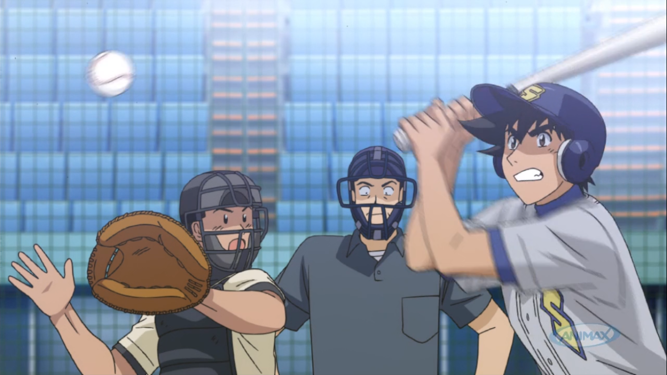 The game goes on without any scores. At the bottom of the 4th, Komori makes a sacrifice flyball and Mifune scores a run. Yamane also scores a 2-run home-run. The 4th inning ends in a 3-0 for Mifune. At the top of the 5th Miyazaki confronts Yamane and gets a base and Noguchi gets another base with a dead ball. With 2 outs, Shimizu hits and Miyazaki runs to the home base, but is out. The 5th inning ends without any scores. Right after that, Miyazaki is still at the home base, looking for his glasses, that were broke. As he cant see without them, Goro substitutes him. The 6th inning starts, Uchiyama is striked out. Tashiro gets a base with a 4-ball. Fuji is also striked out. Hattori gets another base. Goro is now at bat, but Komori choses to let him walk. He hits an invalid ball but is eliminated for stepping out the box. At the bottom of the 6th, Komori is at bat and reaches the second base, even with Goro's try to eliminate him.