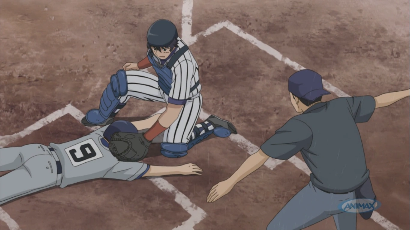 The match goes on and nobody scores during the 6th inning. Akutsu annuls Seishu's batters in the 7th inning and the Kaido's attack starts. Izumi hits and reaches the 2nd base with an error from Tashiro. Akutsu is at bat, makes a bunt and, with another error from Seishu, he reaches the 1st base and Izumi reaches the 3rd. Kusano makes a hit and reaches the 1st base, leaving all the bases full. Goro strikes out Tokashiki and Tashiro eliminates Izumi. With the help of Taiga, Goro also eliminates Yakushiji, ending the 7th inning, with that, Mayumura goes to the bullpen. The 8th inning starts, but Goro is exhaust. Because of his exhaustion he commits an error but gets 2 outs. Egashira rapidly discovers that and order the batters to only make bunts. With that, Egashira reveals all he did to Goro. Tashiro gets the last out. The 8th inning ends still in a tie. The 9th inning starts with Seishu in the attack. With 2 outs, Noguchi, the 9th batter gets a base. After that, Taiga hits and Noguchi scores a run. 5-4 for Seishu.