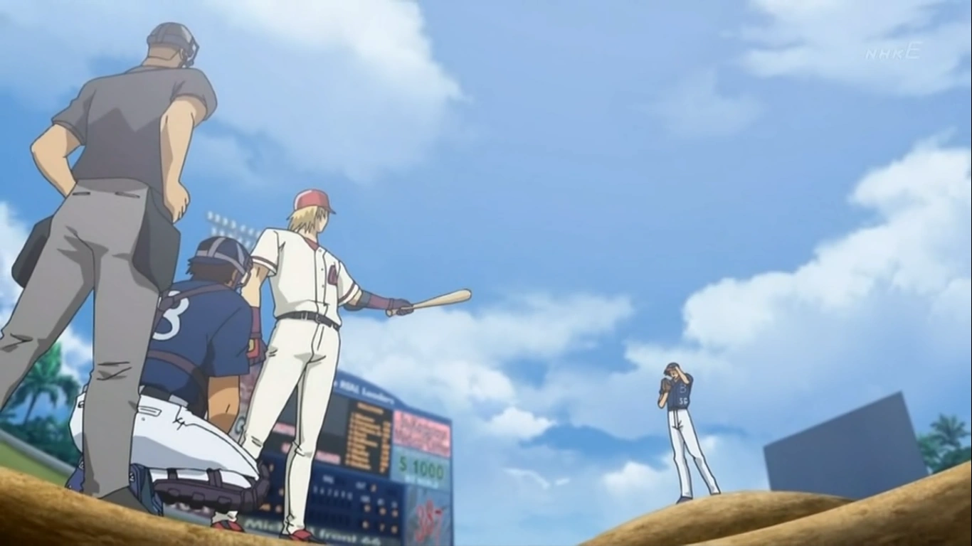 The match against the Falcons starts. At the bottom of the 1st, Junior scores a solo home-run. After that, the Falcons scores another 5 runs. At the top of the 3rd, Goro scores a 2-run home-run. Kellog and the others manages to score 3 more runs. Its 6-5 to Falcons. At the top of the Fourth, Goro is at bat again, but receives a deadball in his left hand.